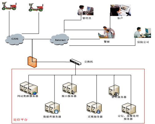 平台除了通过GSM之上的GPRS通道和终端进行通讯之外,还在Internet上,以http协议提供web界面,以供普通用户进行各种终端管理功能,提供管理员对客户的各种管理功能,平台还负责保存终端历史轨迹,用户资料,终端信息,用户和终端的绑定关系,终端的配置,管理等功能。